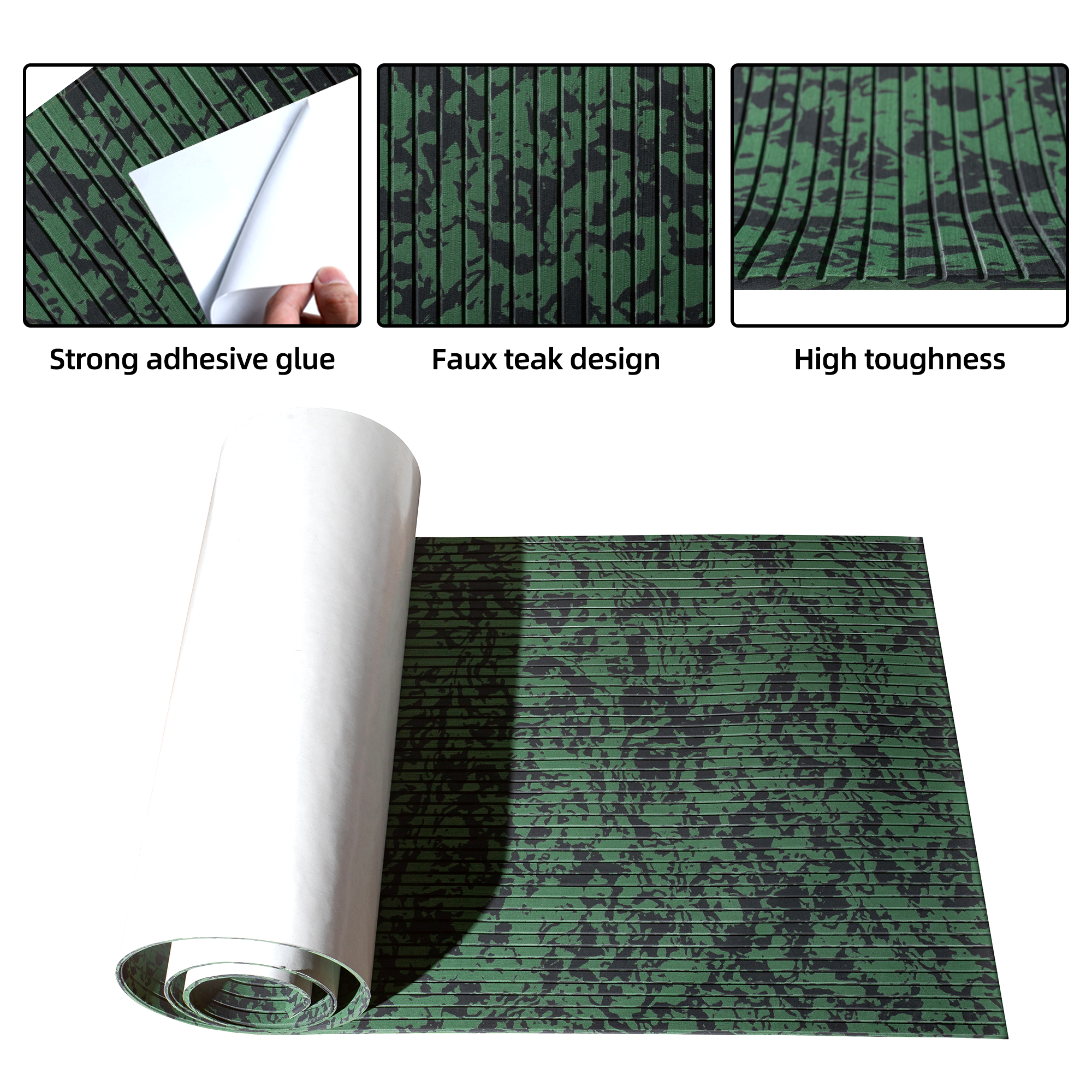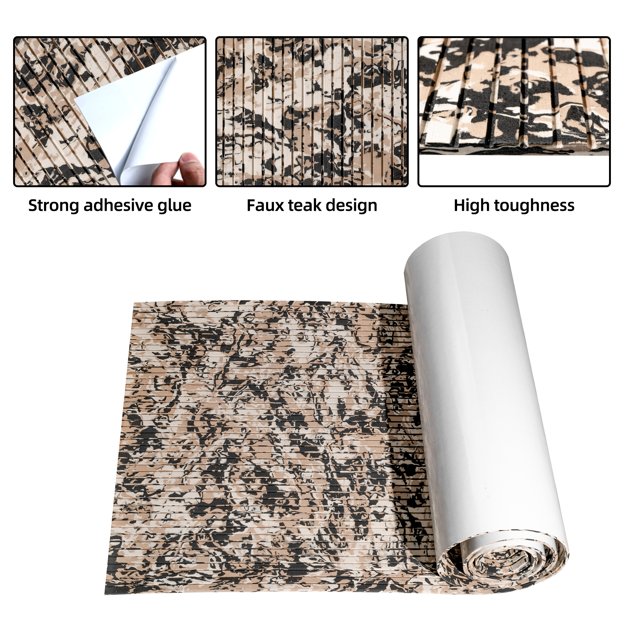 - High Quality EVA Foam - FOCEAN Boat flooring uses high-quality EVA(Ethylene-vinyl Acetate) material, Not easy deformation; High tensile elongation; Not easy to tear or damage; Not easy to fade; High density. Maintain a constant temperature, not easy to absorb heat; Odorless, non-toxic. Strong glue at the back(Extra with super glue), Non-Slip Self-Adhesive. Hardness: 55 (±1P)