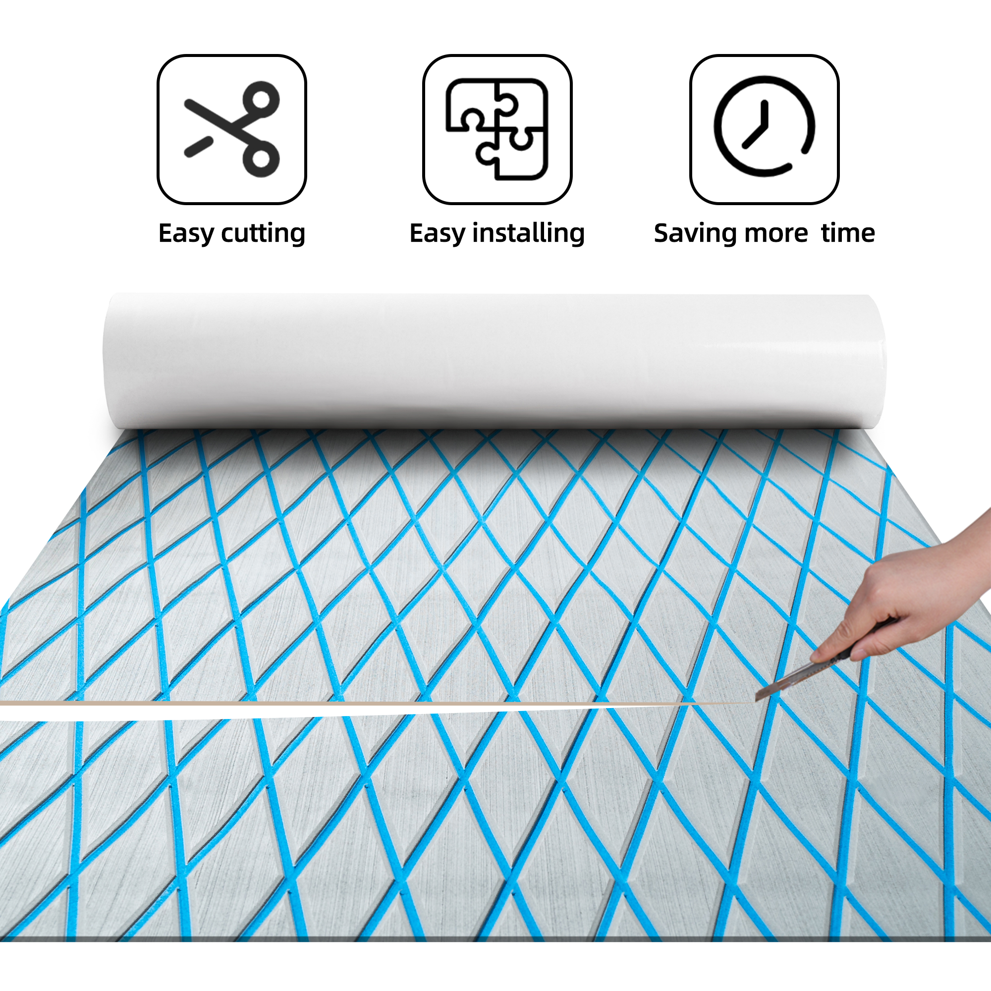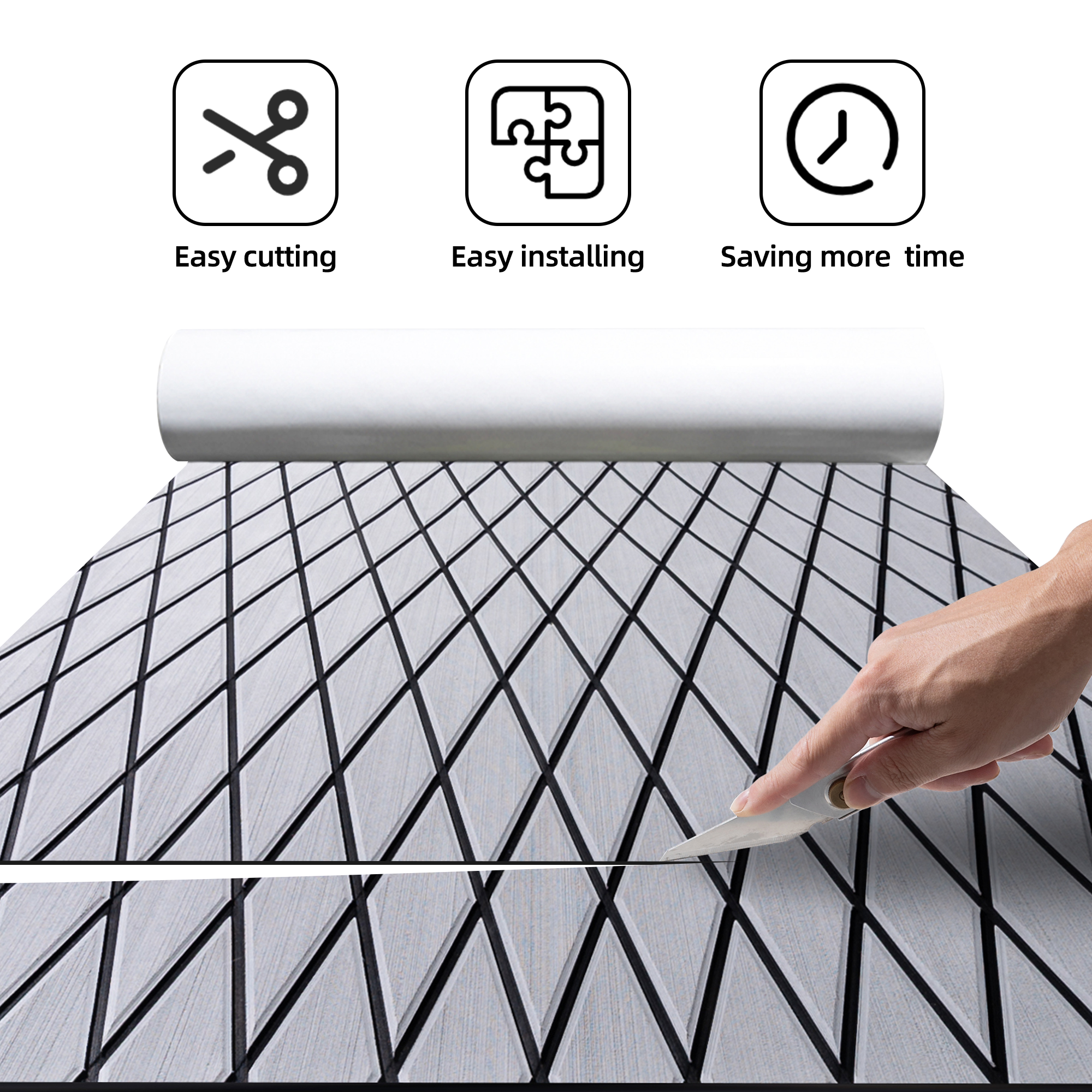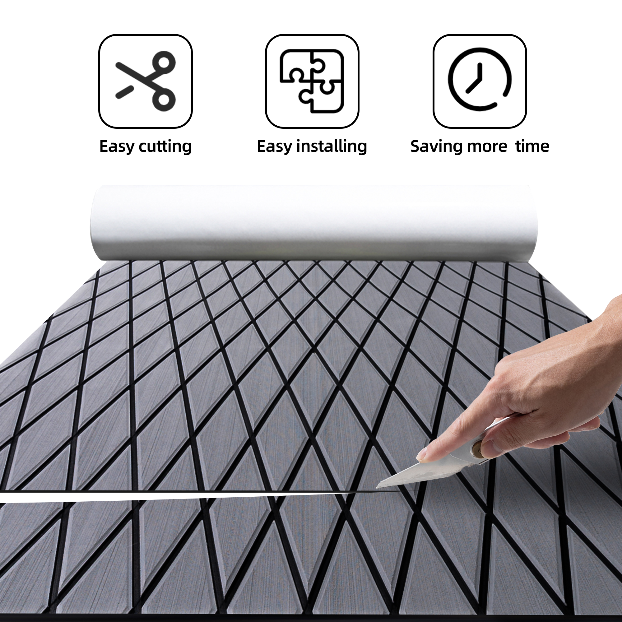 You can use a cutting tool to cut this eva foam boat flooring sheet to any size for installation, with strong glue on the back (please keep the installation site clean). Very easy to cut and hard to fall off after cutting, and it is flat and beautiful. You can enjoy DIY with this marine flooring materials.