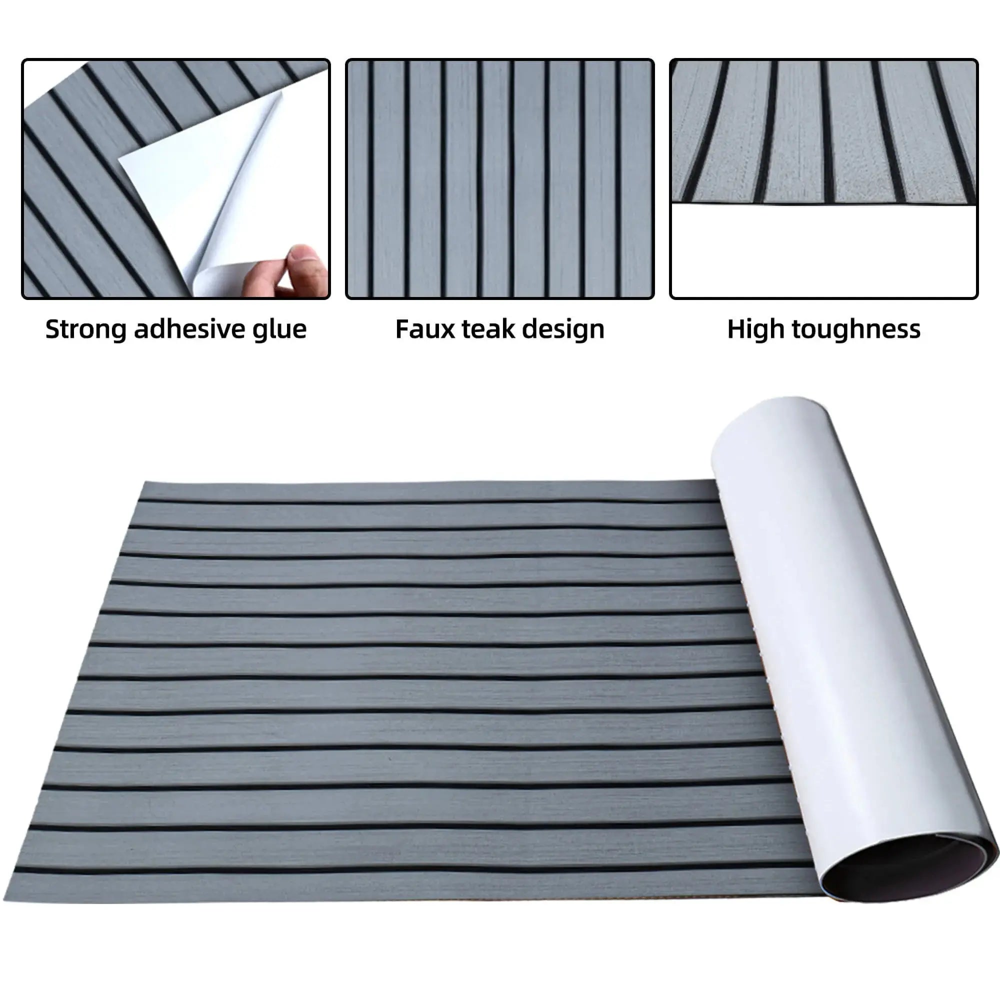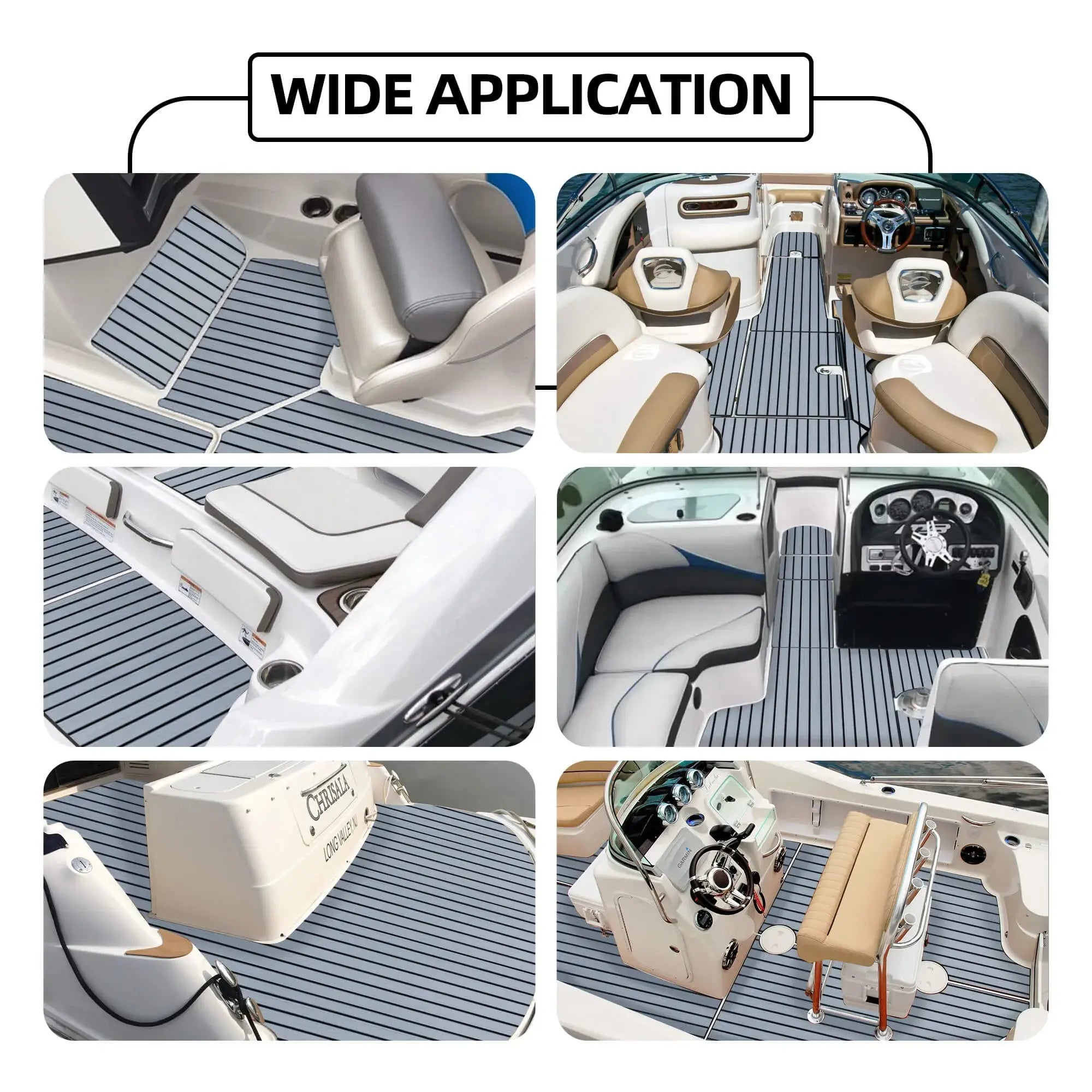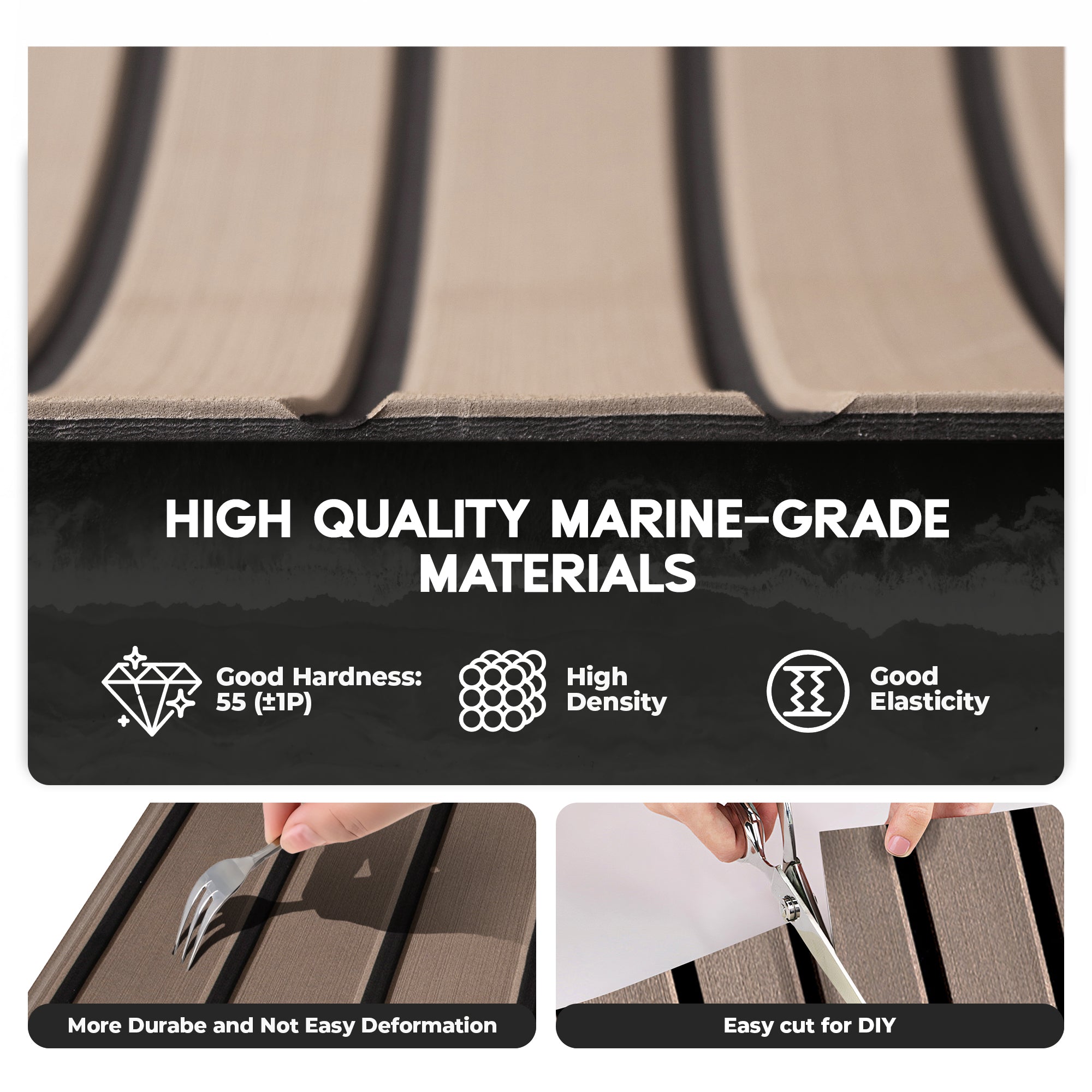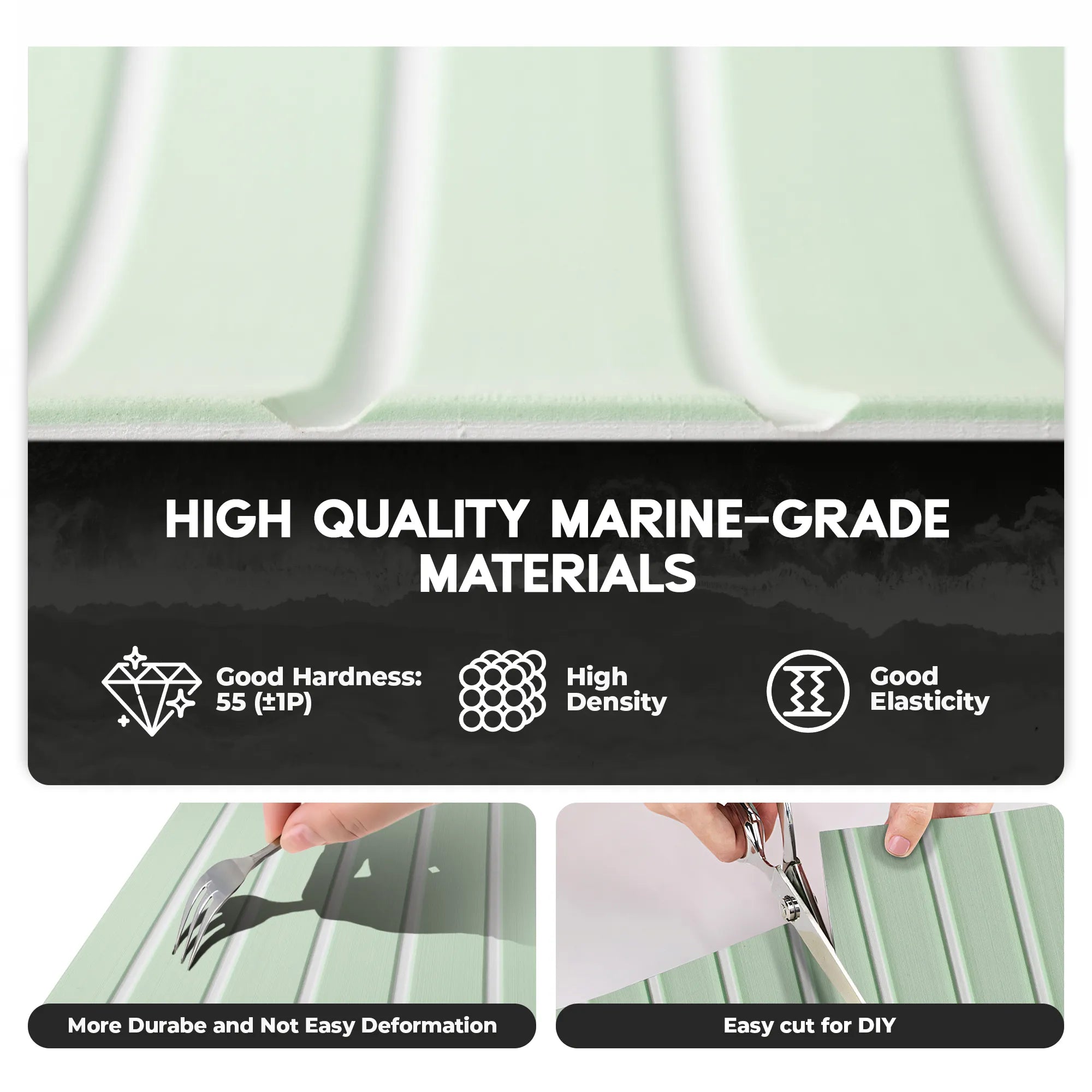 • High Quality EVA Foam - BoatFloorings Boat flooring uses high-quality EVA(Ethylene-vinyl Acetate) material, Not easy deformation; High tensile elongation; Not easy to tear or damage; Not easy to fade; High density. Maintain a constant temperature, not easy to absorb heat; Odorless, non-toxic. Strong glue at the back(Extra with super glue), Non-Slip Self-Adhesive. Hardness: 55 (±1P)