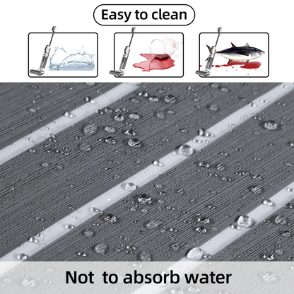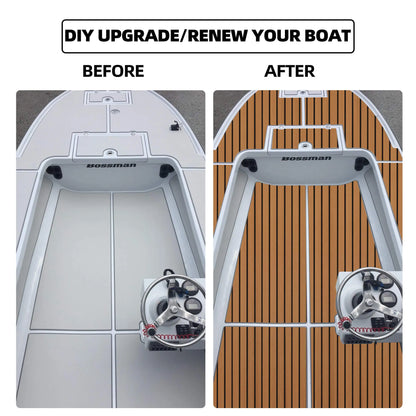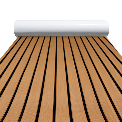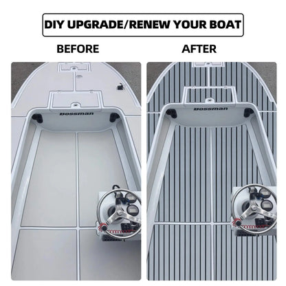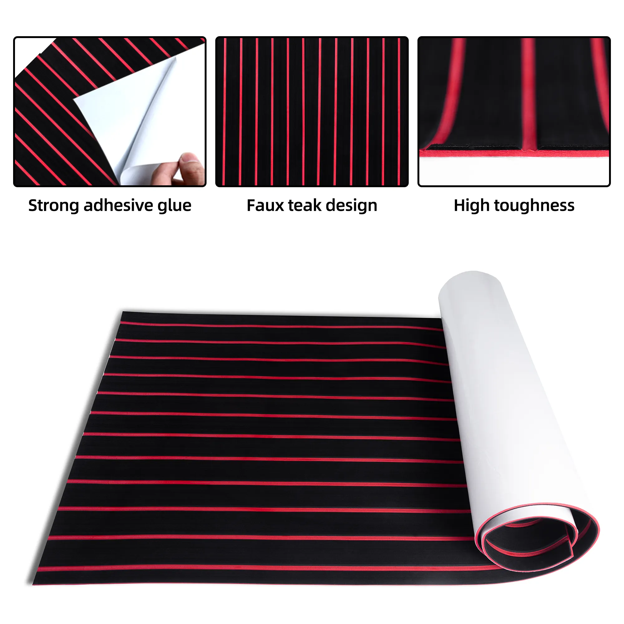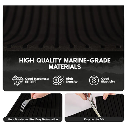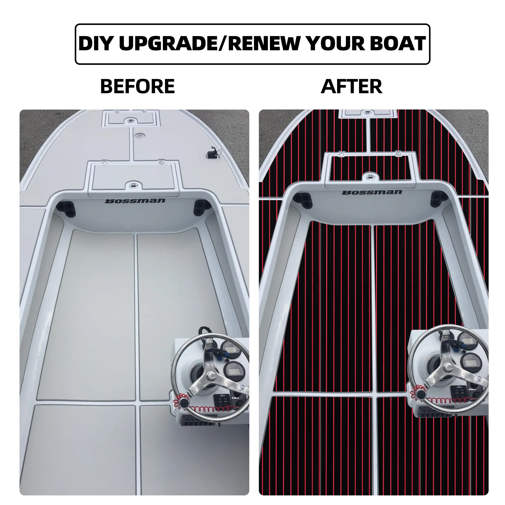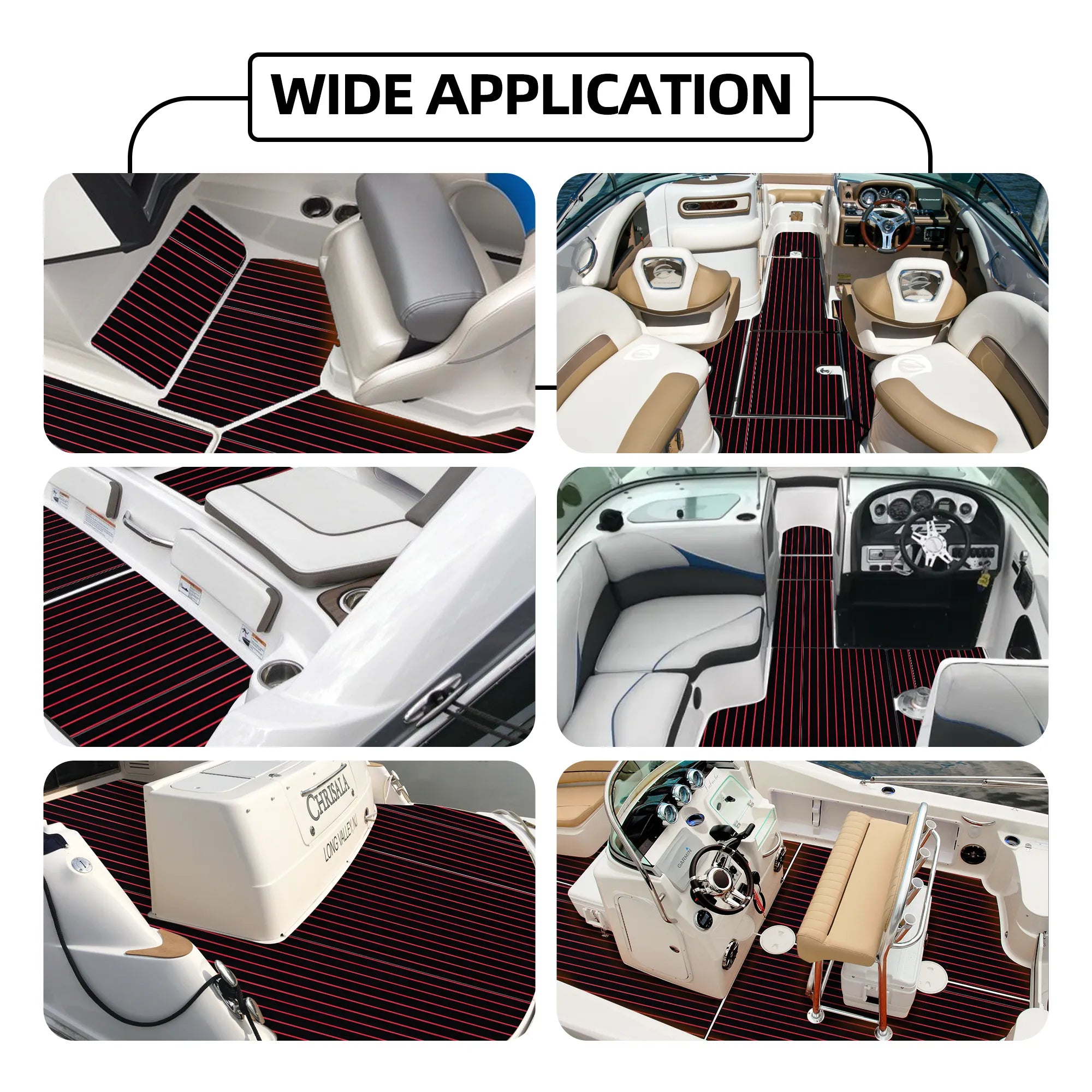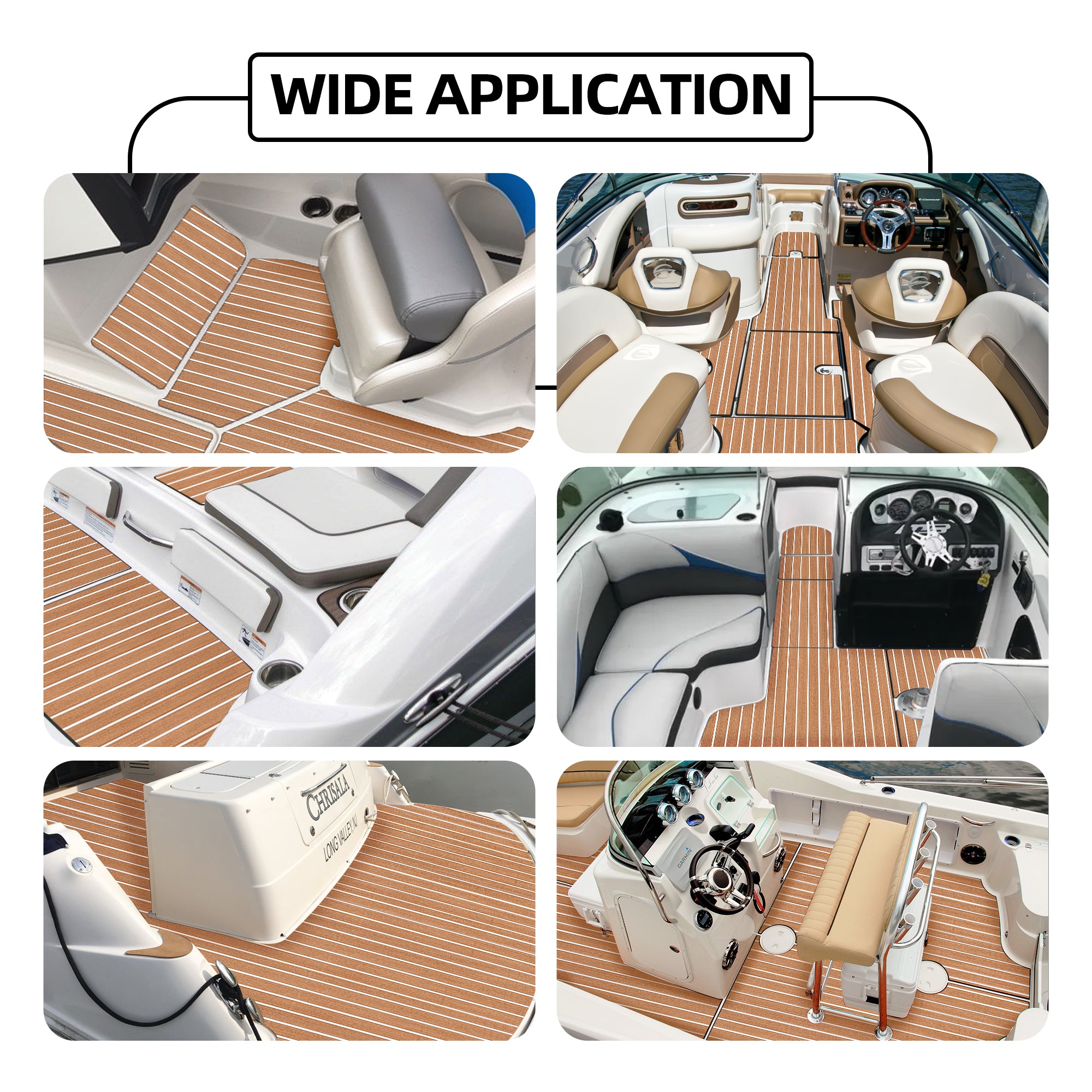 • High Quality EVA Foam - BoatFloorings Boat flooring uses high-quality EVA(Ethylene-vinyl Acetate) material, Not easy deformation; High tensile elongation; Not easy to tear or damage; Not easy to fade; High density. Maintain a constant temperature, not easy to absorb heat; Odorless, non-toxic. Strong glue at the back(Extra with super glue), Non-Slip Self-Adhesive. Hardness: 55 (±1P)